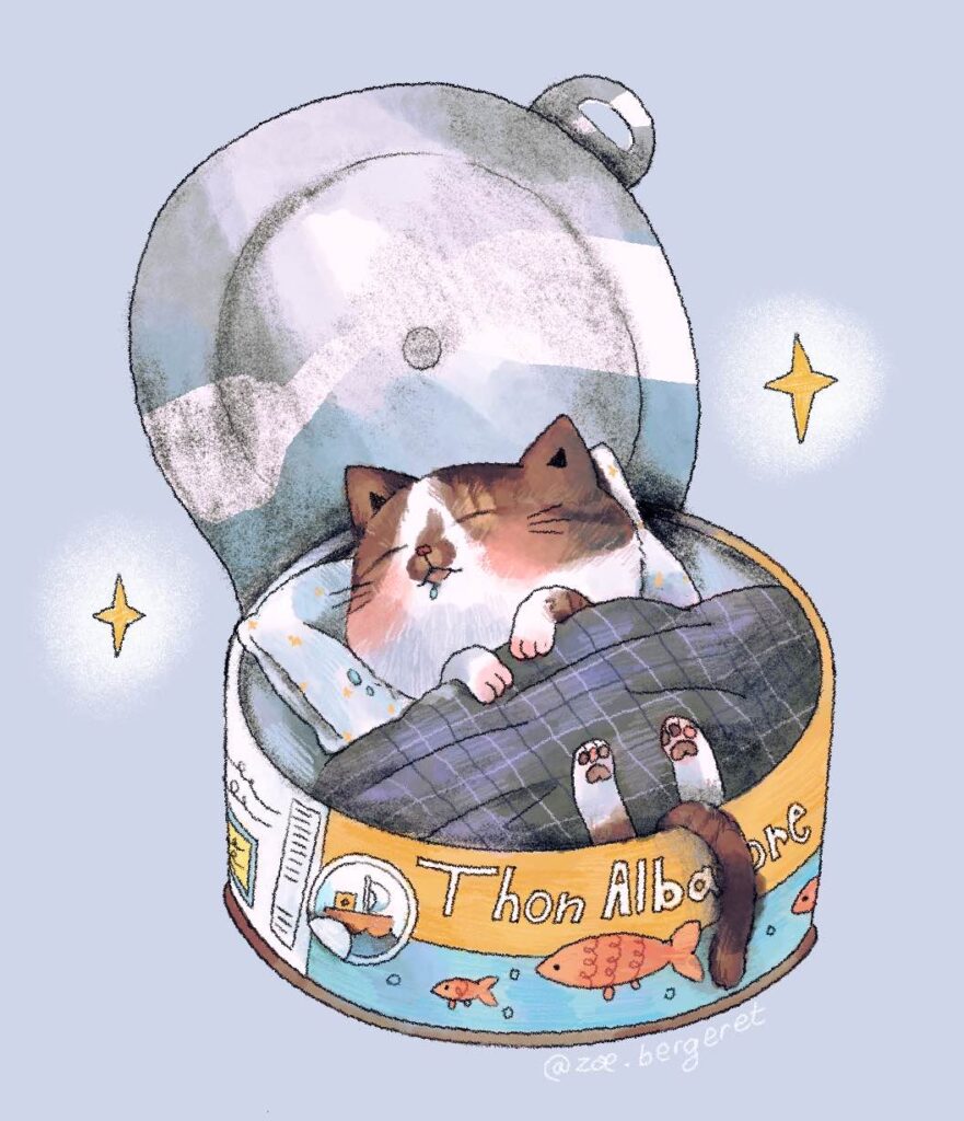 Mon petit chat, Roquefort, endormi dans une boite de thon. Sans doute rêve-t-il de petits poissons.